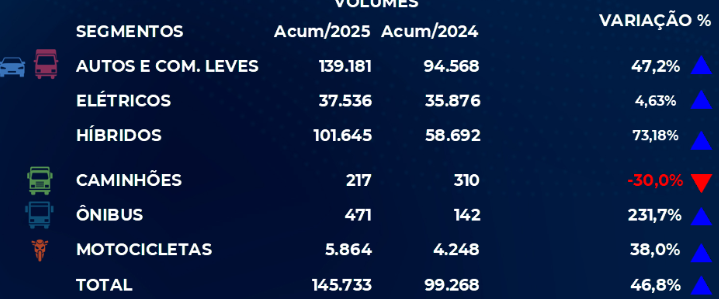 O desempenho, na opinião de Arcelio Junior, Presidente da Fenabrave, reflete um conjunto de fatores positivos, com destaque para a entrada em vigor do Programa Carro Sustentável, que reduziu, desde o dia 10 de julho, a carga tributária de automóveis mais eficientes e acessíveis, antecipando decisões de compra por parte dos consumidores. “O mês de julho teve três dias úteis a mais do que junho, o que ajuda a explicar parte da alta mensal. No entanto, o movimento de alta foi além do calendário. A nova política de IPI para automóveis impactou os preços dos veículos de entrada, o que estimulou a demanda já no mês da sua implementação e deve refletir nos emplacamentos do restante do ano, fazendo com que o setor mantenha o crescimento estimado pela Fenabrave, de 5%. Essa medida, somada a um ambiente de crédito um pouco mais estável, ajudou a sustentar o desempenho positivo de julho para a maior parte dos segmentos em julho “, avalia.