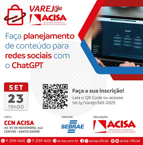 O terceiro dia da segunda edição da trilha de treinamento Varejo 360º, realizado pela ACISA – Associação Comercial e Industrial de Santo André em parceria com o Sebrae-SP, terá como tema o planejamento de conteúdo para redes sociais utilizando o ChatGPT, com destaque para postagens, calendários editoriais e legendas criativas.