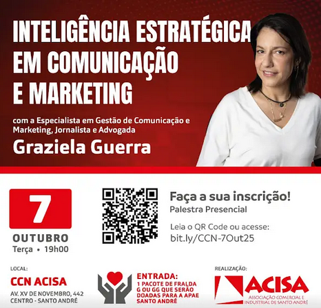 A ACISA – Associação Comercial e Industrial de Santo André, por meio da Academia de Negócios e Inovação, sediará na terça-feira (7 de outubro), às 19h, a palestra Inteligência Estratégica em Comunicação e Marketing, ministrada por Graziela Guerra.