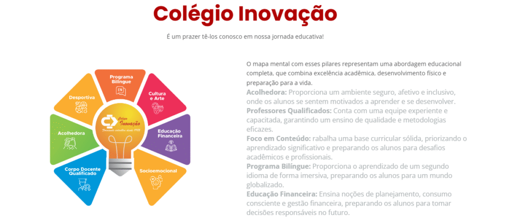 O Colégio Inovação procura integrar o processo: ensino – aprendizagem (interação professor – aluno), incentivando a observação, reflexão e produção objetivando a construção de uma identidade do educando enquanto cidadão, com uma evolução do programa em espiral, visando o seu futuro e o ingresso em boas universidades.