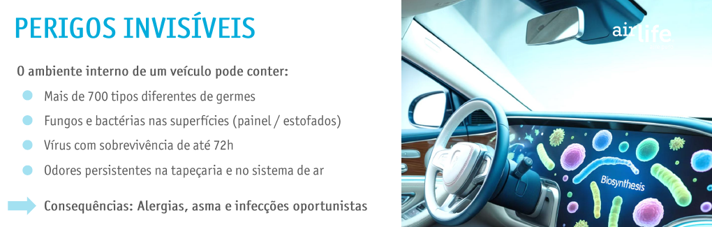 Existem muita exposição ao ambiente interno do veículo, vidros fechados, ar-condicionado, umidade, “qualidade do ar” interno, cada vez mais prejudicial à sua saúde.Vocé sabia que pode haver mais de 700 tipos de germes dentro de um carro, muitos deles ligados a doenças graves,? Estudo realizado pela Universidade de Nottingham, comprovaram!