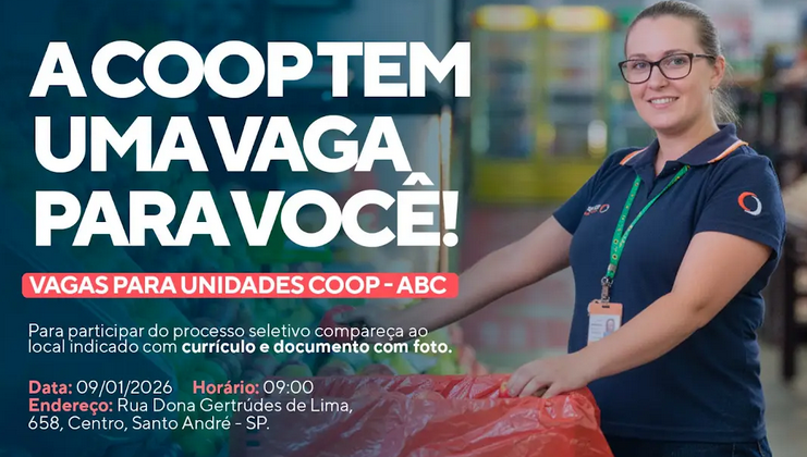 A ação acontecerá na unidade localizada na Rua Dona Gertrudes de Lima, 658, no Centro de Santo André, e contempla vagas em todos os setores da rede. Existem oportunidades também nas outras regiões onde a Coop mantém operações, como São José dos Campos, Sorocaba, Tatuí e Piracicaba.