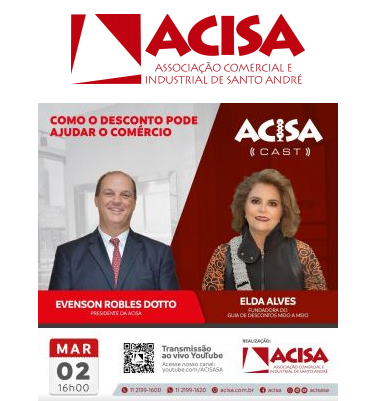 O programa será transmitido ao vivo pelo canal da ACISA – neste dia, o presidente da ACISA, Evenson Robles Dotto, recebe no estúdio Elda Alves, fundadora do guia de descontos Meio a Meio, que reúne serviços, comércio e gastronomia da região do Grande ABC.