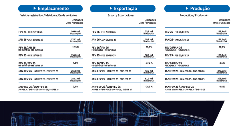 O mercado interno vem mostrando comportamento resiliente neste início de ano. Os emplacamentos somaram 355,7 mil unidades, repetindo o bom desempenho do primeiro bimestre de 2025. Fevereiro foi um mês especialmente positivo para as vendas de autoveículos, registrando média diária de 10,3 mil unidades, acima das 8,1 mil de janeiro e das 9,2 mil de fevereiro de 2025. Trata-se da segunda melhor média para o mês dos últimos 10 anos.