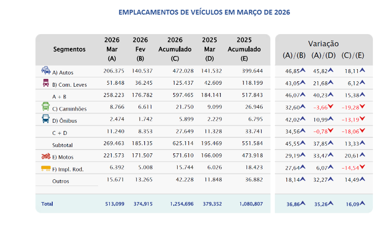 Embora a base de comparação tenha sido favorecida pelo calendário (março de 2026 contabilizou 22 dias úteis ante 18, de fevereiro de 2026, e 19 em março de 2025), o resultado sinaliza melhora efetiva do ambiente de consumo. “O mês de março confirmou um mercado mais dinâmico, com desempenho disseminado entre os principais segmentos e um primeiro trimestre que já se posiciona entre os melhores da série histórica. O calendário ajudou, mas os dados mostram também uma reação consistente da demanda”, afirma o Presidente da Fenabrave, Arcelio Junior.