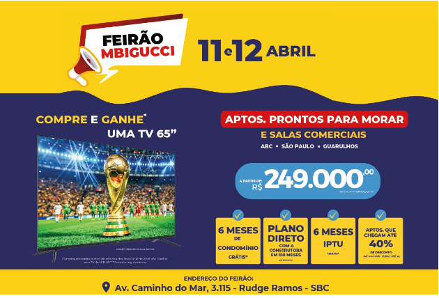A construtora MBigucci promete movimentar o mercado imobiliário com um grande evento de vendas nos dias 11 e 12 de abril. O Feirão MBigucci terá apartamentos novos, prontos para morar ou investir, de 1,2 e 3 dormitórios, além de coberturas e salas comerciais nas melhores localizações do ABC paulista, da cidade de São Paulo e de Guarulhos. Informações antecipadas no WhatsApp: (11) 98823-4590.